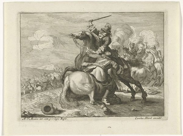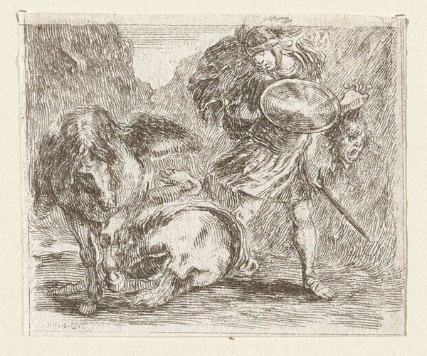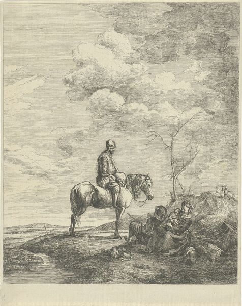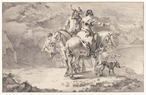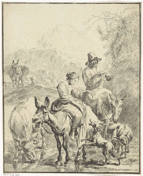 Curator: Looking at this drawing, my immediate sense is of a slightly melancholic pastoral scene, sketched with remarkable efficiency. The ink strokes convey both movement and stillness. Editor: Indeed. What we have here is "Man on a Donkey," dating back to 1828, by William Young Ottley, currently held in the Rijksmuseum. It's an ink drawing, demonstrating the artist’s interest in rendering genre scenes with elements of realism. Curator: The positioning of the figures immediately speaks to social hierarchy and labor. Look how the man on the donkey is elevated both literally and figuratively above the woman carrying what appears to be a heavy load on her head. It's impossible to ignore the imbalance. And observe, too, how even the donkey itself has been burdened. Editor: From a formal perspective, the use of line is fascinating. Ottley masterfully varies the line weight to create depth and texture. Notice how the foreground sheep are rendered with greater detail compared to the more vaguely suggested landscape and figures in the background, creating a very clear spatial recession. Curator: Absolutely. This highlights the power dynamics within this rural setting. Consider the historical context; such scenes often served to normalize existing power structures and idealize agrarian life while conveniently overlooking the hardships faced by the working class. Ottley invites us to ponder who has the privilege to ride and who is condemned to carry. Editor: But what about the artist's intention, wouldn't you agree, remains rather ambiguous? Is it commentary or simply observation? Perhaps a bit of both? There's also a real sense of visual harmony achieved through the strategic arrangement of elements, consider the compositional triangle formed by the figures and the livestock... Curator: True. I can also perceive that he uses familiar and almost hackneyed iconography: burdened bodies set against landscapes that suggest the relentless grind of pastoral life. This becomes, at once, about the literal depiction and the implied narrative of social inequality. It begs us to confront the conditions under which such scenes persist. Editor: Ultimately, Ottley's drawing prompts us to contemplate the inherent paradoxes of rural existence. The artist achieves this intricate depth through economical composition that invites nuanced observation. Curator: A potent snapshot of the early 19th century, encapsulating the complicated interplay of humans and the world around them, urging us to rethink labor, ownership, and the often-unacknowledged toil behind rustic beauty.