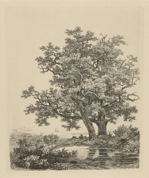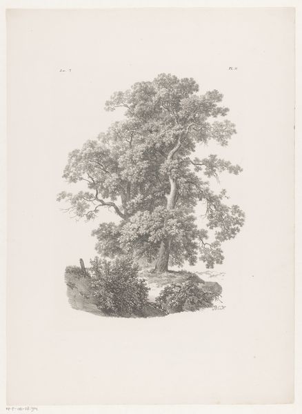 Editor: We're looking at "Studier efter Naturen med Hensyn til Landskabstegning af S.H. Petersen," number 6, made in 1816 by Søren Henrik Petersen. It’s a detailed engraving or print of a massive tree. I'm struck by how imposing and meticulously rendered the tree is. What do you see in this piece? Curator: Well, considering this work within its historical context, I see more than just a tree. Landscape art in the 19th century was frequently intertwined with ideas of nationhood and identity. Consider, this "study from nature" was likely intended to guide other artists. How might that affect our understanding of the image? Editor: It’s part of a set of instructions? Does that mean the focus shifts from purely aesthetic to something educational? It's less about emotion and more about... replication? Curator: Precisely. Petersen isn't just showing us a beautiful tree. He’s presenting a model for understanding and representing nature. Landscape drawing was, in a way, democratized through these types of study guides. Note the level of detail, which reflects a scientific and observational approach, highly valued during the Enlightenment, and informing artistic education long after. Consider how that might have shaped artistic conventions, even beyond the landscape genre. Editor: So it’s like Petersen is setting the standard for how Danish artists should view and portray their own landscape, building a visual vocabulary, if you will? Curator: Exactly! These “studies” were inherently tied to cultivating a specific, often idealized, image of the national landscape and by extension the national character. Think about how museums later displayed similar works: this piece reflects the institution-building impulse to define and disseminate art in Denmark. Editor: That’s fascinating. I hadn’t considered the political dimensions of what appears to be just a straightforward nature study. I’ll never look at a landscape the same way again. Curator: Indeed. Understanding the history around it enhances the viewing experience.