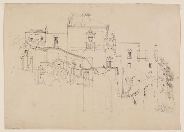 Curator: Here we have Bernardo Bellotto's drawing, "A Capriccio of Palaces and a Loggia Facing a Classical Bridge," created around 1765. It's rendered in pen and ink. What strikes you initially about this cityscape? Editor: Well, it feels very… orderly. Imposing even, with its precise lines and focus on architectural structure. Though a preliminary sketch, its clarity conveys ambition, aspiration... a potent sense of civic pride, maybe. Curator: Exactly. Consider Bellotto's process. As an artist deeply rooted in the tradition of vedute, or view painting, his method demanded accurate representation, and many drawings like this functioned as studies for larger paintings produced later. But not only as 'merely' preparatory tools! Here Bellotto is mediating between observed realities, that is to say a number of elements captured as ‘building portraits’, on the one hand and the ideal image and the playfulness and fictions surrounding the picturesque that underpinned the creation of his market. Editor: Ah, a composite vision! Because the iconography suggests more than a simple architectural rendering. The carefully constructed symmetry, the emphasis on verticality through columns and towers—these recall centuries of symbolic meaning associated with power, stability, and the idealized city. Is Bellotto intentionally drawing on those established motifs? Curator: Undoubtedly. Furthermore, the use of graphite lines—thin, controlled—allowing him to build a dense network, constructing in detail the scene before then reworking individual lines, as it shows its partial overworking with pen and ink, to accentuate particular points, give us hints on the labor involved. Editor: That labor adds another layer to our interpretation. Thinking about the relationship between human effort and these massive, idealized structures... it speaks volumes. And notice the presence of sailing ships, symbols of travel and discovery, nestled into the palatial city’s stage sets, it conjures this moment of both confidence and expanding social boundaries. Curator: Indeed. So, we move from the physical making of this detailed drawing as an object through considering its role as an element contributing to urban fantasies in print. Editor: Precisely. This drawing resonates powerfully on multiple levels. Thank you.
