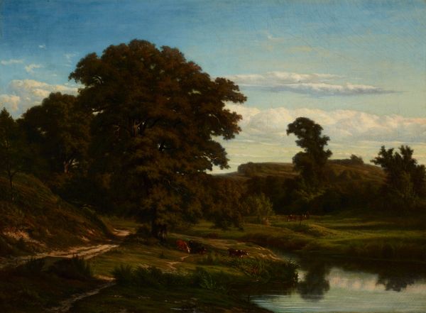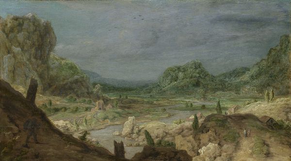 Pieter Stalpaert rendered this landscape, probably in the early 17th century, using oil on a support measuring 66.5 by 114.8 centimeters. The composition divides into distinct horizontal layers. The foreground is dominated by earth tones, leading to a middle ground where verdant trees and fields play against a muted sky. This arrangement creates a sense of depth that invites the eye to wander. Stalpaert's handling of light and shadow is particularly striking; the way he models the clouds and foliage gives the scene a dynamic, almost theatrical quality. This is not a mere replication of nature. Instead, the artist interprets the landscape. The structuralist might see this not just as a landscape but as a constructed space where nature is coded through artistic conventions. The trees, fields, and sky are signs that, when pieced together, create the idea of "landscape." Note how Stalpaert uses formal elements not just to represent but to suggest the order and meaning we ascribe to the natural world.