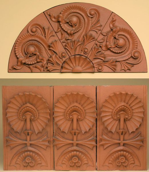 Louis Sullivan designed these terracotta panels for the exterior of the Scoville Building in Chicago, one of the Adler and Sullivan firm's earliest commissions. It required them to remodel an existing Adler structure to accord with a new, much larger addition. The terracotta pieces shown here formed part of the organic decoration of stylized plants with which Sullivan tied the two buildings together. This lunette ornamented the arch above the windows of the top (fifth) story. It has an undulating design of ferns unfurling and would have complemented other organically-inspired terracotta pieces throughout the exterior.