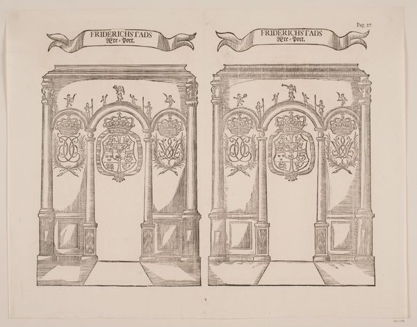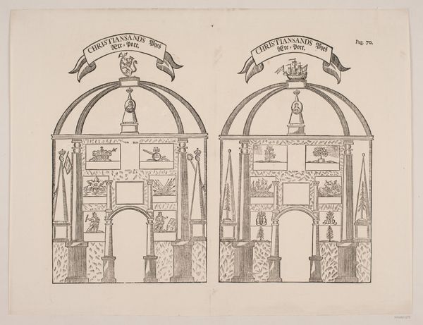 Editor: Here we have an 18th-century etching called "Christianias Æresport" by an anonymous artist. I’m struck by its symmetrical design, two arches mirroring each other. It feels almost like a blueprint. What do you see in this piece? Curator: Blueprints are rarely imbued with such flourish! These aren't merely structural plans, but rather echoes of celebration and power. Consider the era; this piece emerges from the Baroque period, a time when art aimed to overwhelm the senses, to inspire awe. Imagine these arches erected—monumental structures declaring triumph. I can almost hear the fanfare! Notice how each archway contains unique Latin inscriptions? What feelings do they stir within you? Editor: I see them, like little whispers! They definitely add to the formality. Is it right to see this print as propaganda? A way to glorify a specific leader? Curator: Propaganda perhaps carries too much modern weight. It is more that it expresses a desire to imprint authority on the land. Those ships depicted in medallions weren’t just sailing; they were extensions of a sovereign's reach, and reminders of international prestige. Look at the crowns sitting atop these arches – potent symbols, claiming not only earthly domain, but divinely sanctioned right. What a show! Editor: It’s fascinating how something so detailed, so deliberate, can feel both celebratory and, well, a bit cold. Almost clinical, despite its intention. Curator: That’s the paradox of power on paper, isn't it? Frozen in ink, attempting to command eternity. The triumph depicted, carefully constructed for us to witness centuries later. It prompts one to wonder about how we capture and consume these grand pronouncements today. Editor: That's such a thought-provoking point! This has really shifted my understanding of the piece. Thanks!