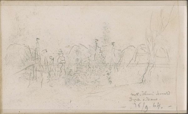 Curator: This is "Figures Near a Cornfield," a pencil drawing by Mark Rothko. What's your initial reaction to it? Editor: Well, I'm immediately struck by its fragility. The pencil lines are so delicate, almost tentative, yet there's a solidity in the figures that draws me in. It's interesting. Curator: It's compelling to consider the societal influences permeating Rothko's artistic vision, specifically when this work emerges, perhaps reflecting a time of agrarian focus. It evokes imagery that taps into themes surrounding agriculture and the human form in nature. We can examine such representations as constructs—challenging accepted narratives of labour and rural life within social classes. Editor: I appreciate your contextualization. My focus is primarily with how Rothko employed tonal values and light in creating this sketch. Notice how certain sections appear blurred as a method of drawing attention towards other crisp details defining objects on the artwork. Curator: And I wonder if it makes any attempt to comment on societal values of rural living during its production and what impact does this visual approach produce? Is it reflective, celebrating, or critical? Such questions invite analysis related gender constructs found during periods when works like these materialized within agricultural paradigms prevalent among diverse global demographics . Editor: That opens it up. Speaking strictly structurally, the organization almost segments, from field on the left to town-like background scenery shown right! Its composition gives your eyes somewhere tangible for them flow around across various subject present drawing then settle comfortably anywhere! Curator: It presents opportunities through lenses addressing socioeconomics, examining representations of ordinary workers vis-à-vis class and labor dynamics prevalent around agriculture in times contemporary that possibly sparked contemplation for even the artist creating pieces reminiscent of scenarios . Editor: Absolutely! Ultimately, though, I'm captivated just what subtle elegance exists with this specific combination pencil strokes producing work evoking serenity yet stimulating my vision quite skillfully by just bare medium use; so profoundly. Curator: By exploring Rothko's pencil drawing through different angles, it broadens appreciation not just form art, allows engage histories, sociology along gender/identities connected back relevant themes today that continues evolving society. Editor: I'd say a fresh assessment brings one full-circle—allowing art both reflect existing circumstances around also provide pathways comprehend humanity further than originally seemed might possibly even achievable ever viewing piece purely regarding aesthetics at start initially either direction considered either/neither simultaneously .