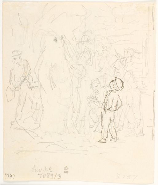 Curator: This is a drawing by George Richmond, completed around 1864. It’s a compositional study for a piece titled “Comus—The Measure.” The work employs both pencil and ink. Editor: My first impression is one of dynamic energy. There’s a real sense of movement captured here, even though it's just a sketch. Curator: Indeed. Note the swirling lines used to delineate the figures and the landscape. This use of line is central to conveying a sense of Romantic dynamism, particularly evocative in sketches as they seem to capture an ephemeral quality. We can clearly identify figures engaged in some form of interaction or struggle. Editor: I see strong classical references. That central figure, arms outstretched, reminds me of depictions of ancient heroes or even Prometheus bound. I wonder if Richmond intended to evoke a sense of classical tragedy here? Curator: It is likely a meditation on classical ideals. Richmond was quite interested in idealizing form through structure, though without dismissing romantic interpretations; what can be perceived here are the basic structures but no concrete meanings. Editor: There's definitely an atmosphere of conflict or perhaps intense decision-making. Are there repeated figures within the sketches? Curator: Yes, there are indeed repetitions, and each of them highlights a single and constant search. It allows Richmond to explore different arrangements and poses for the characters within the final composition. The repetition serves to investigate these relationships further within a controlled setting before translating them into paint on the recto and verso. Editor: The nudity, or implied nudity, contributes to the feeling of vulnerability and rawness. In mythological art, nudity is used to show humans at their most essential and exposed. So here as well, the human form speaks with immediacy. Curator: It’s the juxtaposition of raw, sketch-like lines with these carefully posed, idealized bodies that holds my attention, it showcases that classical structure does not restrain but supports romantic sensibility. Thank you for noticing that with the nude aspect! Editor: Ultimately, what resonates with me most is the timelessness of the piece, achieved with a convergence of form, the subject's vulnerability, and that underlying classical symbolism. Curator: I appreciate how we delved into those formative aesthetic considerations for a finalized vision—perhaps viewers will have insight regarding their vision of Romantic-Classical intersections as well.