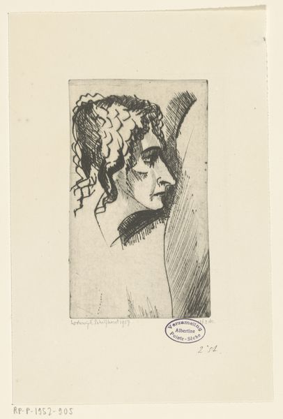 Editor: Here we have Elie Nadelman's "Woman's Head in Profile." It's an etching. It's so delicate and refined. What do you see in this piece? Curator: I see the echo of archaic sculpture, a stylized ideal. Her hair, arranged in those perfect, almost geometric forms, recalls ancient Greek hairstyles. It suggests enduring notions of beauty and order. Do you feel that connection? Editor: I hadn't considered that, but now I see it! It’s like she's been pulled from another time. Thanks!
