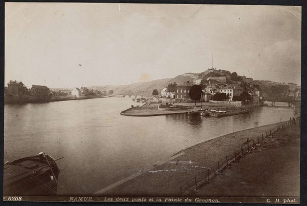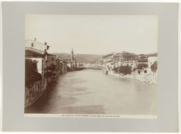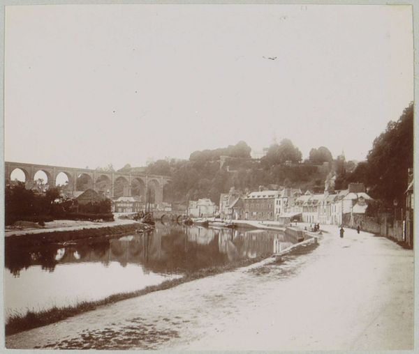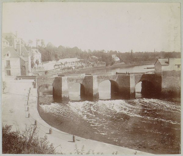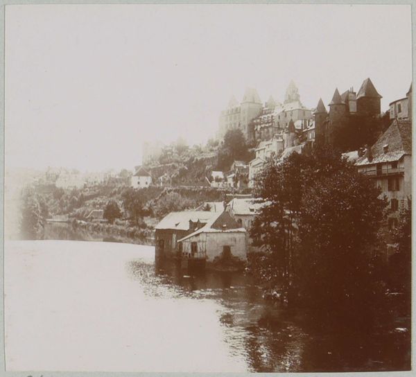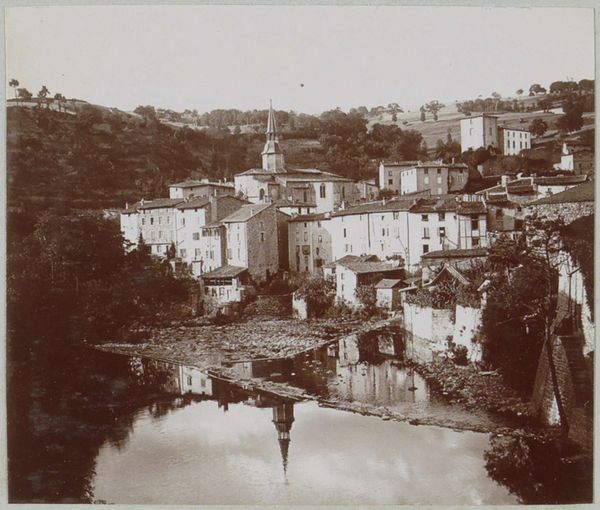 Editor: This photograph, "Waterval in de Jordanne te Aurillac," taken in 1903 by Delizy, showcases a cityscape with a prominent river and waterfall. The monochromatic palette lends it a rather subdued, almost melancholic atmosphere. What can you tell me about this photograph? Curator: This image provides a fascinating lens through which to examine the relationship between urbanization and nature at the turn of the century. Consider the built environment pressing in on the Jordanne River. How does this industrial encroachment impact our understanding of environmental justice? Editor: That’s a great question, I hadn’t thought about it that way. It’s easy to get lost in the pretty scene, but… Curator: Precisely. And isn’t the aesthetic choice of photography as a medium significant here? The documentary quality can highlight the contrast between the idyllic image of the waterfall, often associated with "pure" nature, and the encroaching structures. The muted tones flatten the sense of the image, no? Editor: Definitely. It’s not as romanticized as a painting of the same scene might be. Curator: Indeed. The flatness almost speaks to the reduction of lived experience caused by industrialization and urbanization. And whose stories are included or excluded by this selective capturing of this space? Who had the resources and the power to create images like this? Editor: That makes me consider the perspective of the people who lived in those buildings along the river. Were they celebrating progress or lamenting the loss of the natural landscape? Curator: Exactly! It encourages us to analyze how such images are not neutral records, but constructions that actively shape our perceptions of progress and environmental change. Editor: Thank you! I definitely see how it invites us to consider those issues more critically.