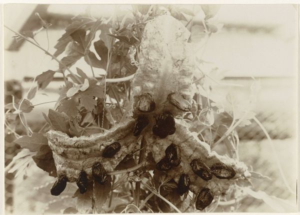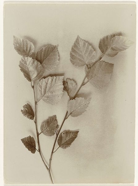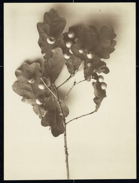 Richard Tepe made this albumen print, "Branch of an Oak (Trees)", sometime in his lifetime between 1864 and 1952. Tepe, who was one of the most important figures in Dutch photography, was a master of landscape and botanical photography. During this era, the natural world began to be viewed through a lens of scientific inquiry. The rise of photography provided a new medium for documenting the natural world, and photographs like this one were used both for scientific purposes and artistic expression. But it is important to remember that landscape photography during this period also played a role in shaping national identity and notions of pristine nature, often ignoring indigenous perspectives and land use. The image itself is a close-up of oak leaves, some with round gall formations, set against a soft, out-of-focus background. The detail is remarkable, with the veins of the leaves and the texture of the galls rendered with precision. The monochromatic palette gives the image a timeless quality, emphasizing form and texture over color. Here the intersection of science and art asks us to reflect on our place within the natural world, and our impact on it.