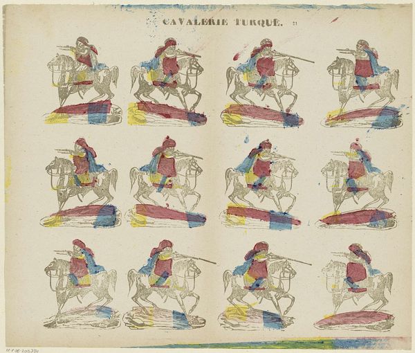 Editor: Here we have "Cavalerie Turque" by M. Hemeleers-van Houter, made sometime between 1827 and 1894. It's a lithograph, a kind of print, depicting twelve mounted Turkish soldiers. What strikes me is the almost whimsical, repetitive nature of the figures, like toy soldiers. What do you make of it? Curator: Whimsical is a good word for it. It reminds me of something I would have found in a little zoetrope as a child! There's something almost charming in the simplicity, isn’t there? Beyond that, though, I see echoes of Orientalism, a Western fascination with and sometimes misrepresentation of Middle Eastern and North African cultures. The figures are romanticized, maybe even simplified to fit a European ideal. I wonder, does that reading resonate with you? Editor: Definitely. I hadn't considered the Orientalist lens so explicitly, but the way they’re presented feels almost… staged. Do you think the repetition is intentional, or perhaps a limitation of the printmaking process at the time? Curator: It could be a bit of both, honestly. Printmaking certainly had its limitations, but the repetition also amplifies that "toy soldier" feeling, right? And it may subtly dehumanize the figures. It's a fascinating tension, isn’t it? A tension between charm, exoticism, and perhaps, a slightly unsettling detachment. Editor: Absolutely. Looking at it now, I can see all those layers at play. Thanks for pointing out the nuances; I feel like I'm seeing it in a completely different light. Curator: And I'm reminded that sometimes the simplest images hold the most complex ideas.