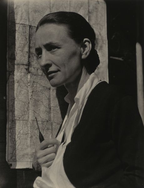 Curator: This gelatin-silver print, created by Paul Strand in 1954, is titled "Alex MacDonald, South Uist, Hebrides". Editor: The face strikes me immediately – weathered and deeply etched. It feels almost archetypal, embodying a specific type of rural stoicism. Curator: Precisely. Strand worked extensively documenting rural communities. I'm particularly drawn to the materiality visible in the photograph – the rough texture of MacDonald's tweed jacket, the chipped paint on the clapboard behind him. The materials speak to a life closely connected to labor and place. Editor: I see so much in that face, and also in his clothes—he has an argyle sweater but a heavy jacket as though he is dressed for utility. His slightly turned gaze feels both wary and inviting, like he has stories etched into his being. Curator: He does. MacDonald was a crofter, a tenant farmer. Look at the interplay of the textures; the gelatin-silver process, allows for such rich tonal variation, which underscores those distinctions between, say, the cloth and the face. The clothing also performs class. Editor: Absolutely. I also wonder about the poster behind him. Partially obscured as it is, it presents us with layers—it feels like the past overlaid on the present—another symbol of how memory and lived experience shape identity, especially in relation to one's location. Curator: The placement of that poster, likely advertising some tool or trade, draws attention to the economic realities structuring MacDonald’s existence. Consider the photographer's choices here; gelatin silver was widely available then. He consciously selected a process tied to accessibility. This echoes Strand's political commitment. Editor: Indeed. Seeing these details prompts considerations on time, memory, place. The image itself is a artifact carrying the weight of a particular moment and now offering echoes that reverberate in our own time and concerns. Curator: Well, from considering both its composition, process and symbolism, I would agree. It compels you to reflect on how these forms relate to what they stand for, from past into the present. Editor: It's more than a picture, it is an opening into ways to understand who we are, in our places and memories.