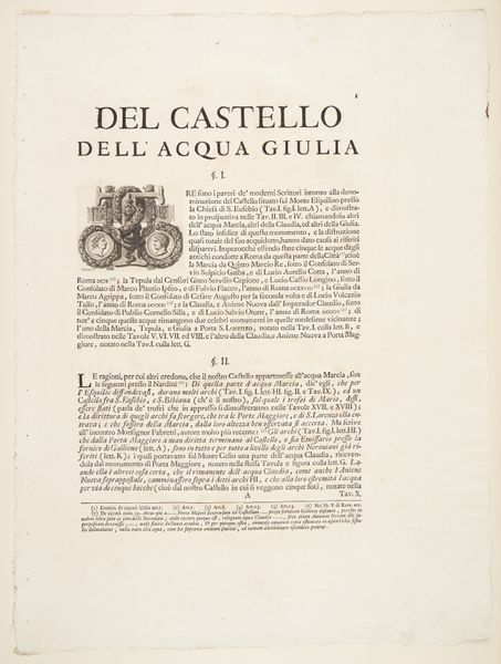 Editor: Here's a fascinating text sheet from 1761 by Giovanni Battista Piranesi titled, "Concerning the manner in which the ancient Romans distributed the water for the use of the city. Text sheet with the letter \"V\"". It’s an engraving on paper, and the detail is just incredible. The mood seems quite scholarly, almost like an architectural treatise. How do you interpret this work within its historical context? Curator: This print gives us insight into the historical role of printed imagery. It not only explains, but also legitimizes. Consider how Piranesi is representing the systems of Roman water distribution. He's not just showing us the mechanics, he's also attempting to document and almost enshrine them as a critical piece of civic engineering. Think about the socio-political implications. Editor: So, it’s about more than just showing how the aqueducts worked? Curator: Precisely. This engraving reinforces the idea of Rome as a pinnacle of civilization, particularly regarding public works and organization. Piranesi positions himself as a chronicler of this legacy. The act of printing, and disseminating such imagery, contributed to shaping a collective memory, a specific visual language surrounding Roman achievement. Who benefits from that, and how? Editor: That makes sense. By presenting these Roman methods in such detail, he's contributing to a certain historical narrative. It is all about influencing public perception, of course, with architecture as a main ingredient in socio-politics. Curator: Yes, consider how this imagery, circulated as a print, contributes to shaping architectural and engineering aspirations within a specific intellectual climate of the 18th century. So, what’s your biggest takeaway? Editor: It is how deeply interwoven art, architecture, and politics are. The print isn't just documentation; it's actively participating in shaping the cultural landscape and historical perception. Curator: Exactly. Recognizing that the seemingly straightforward depiction can embody a range of ideological purposes, now you’re starting to see!
