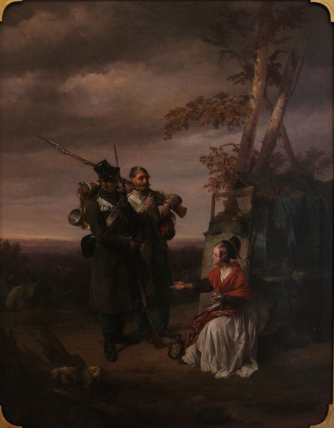 Victor Müller painted *Hamlet and Horatio in the Churchyard,* now at the Städel Museum, using oil on canvas. At first glance, the muted tones and the somber expressions of the figures evoke a feeling of melancholy. The scene is structured with a stark contrast between the light upper portion, dominated by the stormy sky, and the darker, earth-bound lower half where the figures are positioned. Notice how Müller uses the motif of the birch tree to frame Hamlet, drawing the viewer's eye towards him. Hamlet is caught in a moment of contemplation. Horatio is a grounding figure, physically connecting Hamlet to the scene, yet they remain detached from the gravesite. The composition directs our interpretation of the play's themes: mortality and introspection. The artwork challenges us to consider how the formal elements of painting can serve to visualize complex emotional and intellectual states. It is an invitation to reflect on the broader human condition.