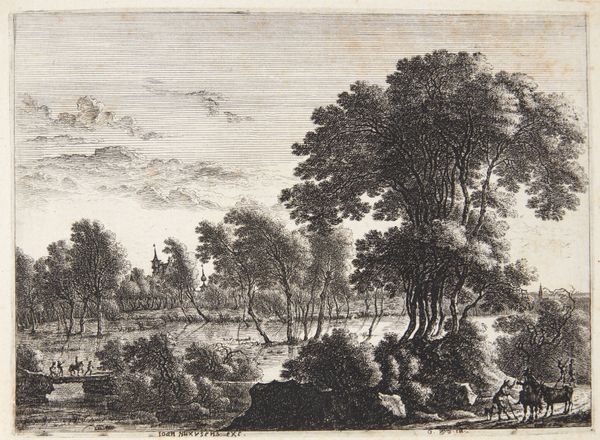 Curator: Here we have Jens Peter Lund’s “Skovparti ved Naerum,” an engraving dating back to 1851, part of the Statens Museum for Kunst collection. Editor: The level of detail is remarkable for an engraving. My first impression is one of tranquility, but there is something about the way the path curves, almost disappears that makes the artwork quite eerie as well. Curator: That path does lead the eye, doesn't it? The romantic sensibility of nature is carefully balanced here with the symbolic promise of finding the way forward, which the path illustrates, although what lies at the end remains veiled. The light also guides us. Editor: Indeed, and note how the artist uses contrasting textures, the roughness of the thatched roof and the delicacy of the foliage, to add a touch of complexity to this piece. There is an interesting use of the golden ratio here as well, with the buildings sitting close to one point, creating tension through this asymmetry. Curator: Symbolically, the home represents security, shelter, belonging. The artist subtly portrays this domestic space as part of the wildness of the untamed. This also touches on themes very pertinent in Danish culture: The sense of place and the power of belonging that are evoked when people contemplate nature and landscape. Editor: That reading certainly holds. But look at the way Lund uses lines – vertical in the trees, horizontal in the land – as structural elements in what appears, at first glance, to be a romantic rendering of nature. This brings to light not only his eye, but his artistic sensibility. It isn't only landscape, it’s formal consideration. Curator: It feels charged with something profound about humanity's place within a larger existential framework of belonging and finding one's purpose and belonging in this world. I find myself longing to walk the depicted pathway in the artwork. Editor: For me, this artwork demonstrates that close study always reveals complexity even in what seems a simple landscape engraving. I shall always admire Lund for such structural sensitivity, despite the medium’s constraints.