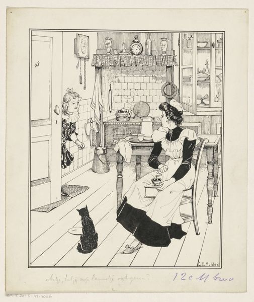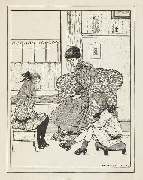 This drawing by Nelly Spoor presents two young girls captivated by a bird perched atop a mantelpiece. The bird, a universal symbol of freedom and the soul, here sits comfortably within the domestic sphere, hinting at the taming of wild instincts. The image evokes the ancient Roman practice of augury, where the flight and song of birds were interpreted as omens. Throughout the ages, this act of observing birds has carried symbolic weight, from religious prophecies to simple musings on the natural world. Think of how the caged bird in art and literature often represents a soul longing for liberation. Note the girls' gazes, filled with a mixture of curiosity and wonder, mirroring humanity's enduring fascination with these winged creatures. This scene is not just an observation of nature, but an unconscious dance with symbols that have fluttered through our collective psyche for millennia. The motif of the bird, therefore, embodies an emotional bridge connecting the human soul with nature.