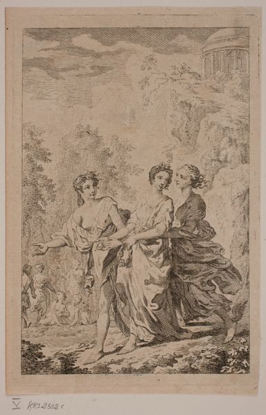 Editor: Here we have Izaak Jansz. de Wit’s pencil drawing, "Kracht (Fortitudo) en Azië," created sometime between 1754 and 1809. The figures have a somber and almost allegorical quality. What do you see in this piece, in terms of its historical context? Curator: This drawing presents a fascinating intersection of power and representation during a period of intense colonial expansion. We see “Fortitudo,” or Strength, likely personified as a European figure, towering over "Azië," or Asia. But look at her gaze – averted, perhaps weighed down by the implications of power? What does it mean to depict "strength" in this way, especially considering the context of colonial trade and exploitation? Editor: It’s like the drawing acknowledges the cost of this power dynamic. I hadn’t considered that angle. Curator: Exactly. Consider the time this was made – the Dutch East India Company was at its peak, extracting immense wealth from Asia, but also engaging in violent conflicts. Is this drawing celebrating strength, or is it a critique of the forces at play? How does the contrast between the confident "Fortitudo" and the downcast "Azië" complicate our understanding of Dutch power in Asia? Editor: I see what you mean; the artist is using those poses and expressions to speak to more complex political ideas than just the glory of the Empire. I'm thinking of the "history-painting" tag – so how does it fit that genre? Curator: The ‘history-painting’ theme opens an opportunity for political commentary through a more subtle use of allegory. Do the soft lines of the drawing mitigate or amplify its statement of domination? Editor: Now, when I look at it, it seems more like a prompt for us to investigate and unpack those historical narratives. I thought it was just a simple sketch at first. Curator: That's the power of engaging with art from an intersectional perspective; it challenges us to look beyond the surface and consider the underlying narratives shaping our world.