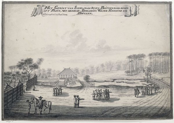 Editor: This is "View near Bruges" by Martin de Monchy, made sometime between 1746 and 1830. It's an etching, so lines dominate. The overall scene is a road leading towards a distant village, but what strikes me is how the figures almost seem like they're emerging from the landscape itself. What do you see in this piece? Curator: Indeed. The "emergence," as you call it, is quite intentional. Consider the etching not simply as a depiction of a landscape but as an assertion of place, status, and memory. This is not just "near Bruges"; it is "Vue Près de Bruges" – a view presented *with dedication.* Editor: With dedication? To whom? Curator: Precisely! Notice the inscription dedicating it to Messire Charles, a Baron. It speaks to a visual language of patronage. The figures aren't just passersby, but emblems within a carefully constructed visual vocabulary. Each figure, each horse, each tree almost serves as a signifier within a larger social and symbolic order. Think about how landscapes were often employed to reinforce notions of ownership, legacy, and belonging. Does the dog running to the right tell you anything? Editor: I hadn’t thought of the dedication, but the dog could show companionship. So the landscape almost becomes a stage, with each element carefully placed to convey social meaning. Curator: Precisely. The seemingly simple scene becomes quite complex when viewed through this lens. Landscape as social narrative. Editor: I never considered how loaded with meaning something that appears to be a landscape can actually be. Thanks! Curator: A pleasure. Now, think of other examples where landscape serves purposes beyond just depicting pretty scenery. The visual language of power is everywhere once you start to look.