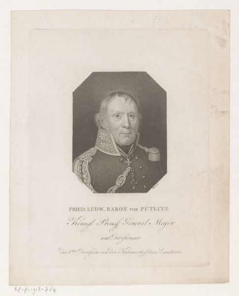 Curator: Welcome. Here we have a printed portrait of Friedrich August of Saxony, likely created between 1792 and 1816, held within the Rijksmuseum's collection. Editor: The first thing that strikes me is the tonal range. It's almost monochromatic, yet there's a softness, an almost velvety quality to the shading that draws you in. Curator: Indeed. As an engraving, it relies entirely on line and tone to create form and depth. Notice how the engraver uses fine, closely spaced lines to build up darker areas and create a sense of volume in his face. Also observe his stern look! Editor: Right. But I’m also intrigued by the material context of something like this. Think about the labour involved: the artisan crafting the copper plate, the paper itself—its quality suggesting a certain level of wealth and privilege associated with both the sitter and the print's intended audience. This isn't a quick sketch; it is about social communication through reproduction. Curator: Agreed. Its meticulous detail elevates this reproduction. Look, the textures on his uniform, the glint of the medals—it conveys status, power, and all the neoclassical aspirations through its crisp execution. Editor: And the choice of engraving reinforces that. This technique, involving cutting into a metal plate, seems perfectly suited to reproducing the hard-edged, idealized forms characteristic of the era. Each impression signifies a tangible exchange and affirms identity of stature in society. Curator: Furthermore, notice how the print medium itself facilitates dissemination. It makes this image widely accessible, extending the reach and impact of its political messaging far beyond the court circle. Its precision mimics truth, lending him a stoic timelessness beyond paint's ability to conceal. Editor: Precisely. It’s about creating and distributing an image—of authority. We see in every impression traces of work, distribution, access... revealing far more than simply the likeness of the sitter. Curator: Well said. This exploration unveils how artistry and craft coalesce to form a narrative—or perhaps better stated, to engrave an idea of power—into the fabric of history. Editor: Right, the print transforms our engagement with the persona it tries to represent into something tangible: the confluence of image, process, material. It becomes, in itself, history incarnate.