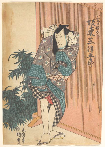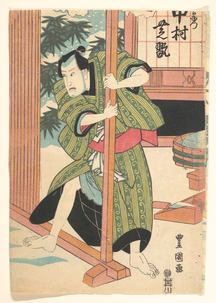 Utagawa Kunisada created this print sometime before his death in 1865. Kunisada was a commercial artist in Japan, during a time when the country experienced significant social change. Here, a male figure in a patterned kimono strikes a dramatic pose with a sword. This is likely an actor in a Kabuki play, a popular form of entertainment in Japan during the Edo period. Kabuki allowed a space for alternative narratives, including stories that challenged the strict social norms. Kunisada made thousands of actor prints during his lifetime. This print provides a glimpse into the cultural world of 19th century Japan, where theater offered a stage for exploring themes of gender, identity, and social critique. While Kunisada's prints were made for mass consumption, they also reflect the nuances and complexities of Japanese society at the time.