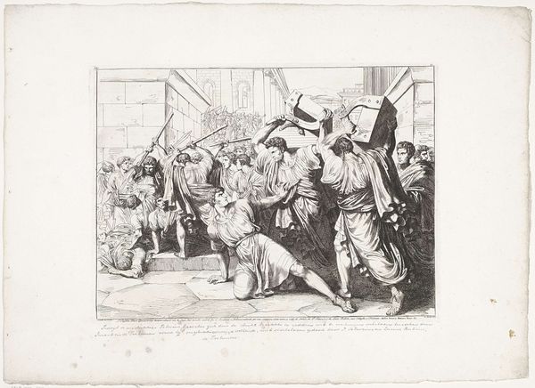 Editor: Here we have "Aanval voor de slotpoort", or "Attack at the Castle Gate," an etching by J. Kuyper, dating from around 1860 to 1870. The scene is really intense, so dynamic, full of figures struggling near what looks like a castle entrance. What stands out to you in this print? Curator: The raw emotion and the struggle for power are immediately apparent, aren't they? Kuyper situates us in a historical context of conflict, likely drawing from Dutch or European narratives. I think it’s important to consider whose stories are being told. Who are the aggressors and who are the victims here? Are they representative of a broader social commentary? Editor: I see the figures grappling, but it's not immediately obvious to me who's "right" or "wrong." Is Kuyper making a statement, or just showing us a historical scene? Curator: That ambiguity is precisely where the work invites critical engagement. Consider the historical moment—the rise of national identities, colonial power struggles. How might this image play into constructing notions of heroism or barbarity? Are we meant to empathize with the apparent defenders of the gate, or question their authority? Etchings like these often reinforced dominant ideologies. Editor: So, beyond just being a historical snapshot, it might actually be promoting a certain viewpoint? Curator: Absolutely. Art is rarely neutral. By analyzing the composition, the portrayal of different figures, and the implied narrative, we can unpack the loaded messages embedded in what might initially seem like a straightforward historical depiction. Who is in the light and shadow, what clothing, arms or lack thereof is used to illustrate status or intent? Editor: That gives me a lot to think about when viewing historical art. I appreciate this deconstruction of whose perspective is dominant here. Curator: And hopefully prompts reflection on how we interpret similar power dynamics in contemporary visual culture. It’s all about understanding the dialogue between past and present.
