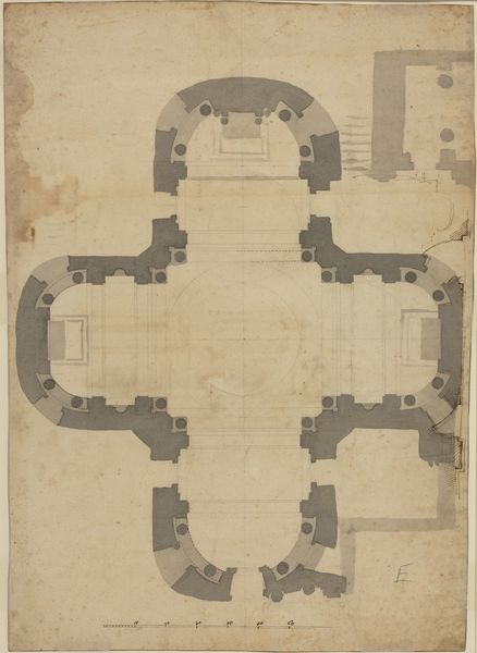 Curator: Welcome. We are looking at an intriguing drawing attributed to an anonymous artist, titled "Ground Plan for an Academy of the Fine Arts," dating from sometime between 1750 and 1790. The work, rendered in pen and ink, presents an intricate architectural design. Editor: It looks like an elaborate pinwheel, or maybe a sort of civic-minded, classically-inspired fidget spinner for giants. The careful detail, though, suggests more a blueprint for enlightened despotism, some perfectly rational layout just begging to be filled with drama and secrets. Curator: Precisely. The radial symmetry, evident in the arrangement of the building's wings extending from a central, possibly rotunda-like core, is characteristic of Neoclassical architectural ideals, an age enamored with order, rationality and classical precedent. Note also the clear, geometric organization that defines the composition. Editor: And those little rooms! They practically scream 'private lessons' and 'secret rendezvous'. This plan might be about art, but you can just imagine all the plotting and gossip swirling through those corridors. Is it just me, or does anyone else sense a certain unease when beauty aims for absolute control? Curator: The design, however, embodies the Enlightenment aspirations for institutions of learning, seeking to create a space conducive to cultivating artistic talent. It represents a kind of utopian architectural project, if you will, reflecting the era's emphasis on knowledge, education, and refinement of taste. Editor: Utopia, yes, but I bet even in utopia artists still argue about space, light and funding! Honestly, all those identical rooms? They risk squashing creativity rather than inspiring it. Curator: Yet the repetitive nature may speak to the structural integrity, ensuring harmony and visual balance, while that imposing central hub is fascinating in the manner it concentrates attention. The clear demarcation, though not visible, suggests an emphasis on functionality in creating spatial arrangements to meet instructional and social demands within an academic environment. Editor: Well, whoever designed this certainly had big ambitions and a T-square! It is certainly fun to ponder a place of pure geometric education. And what artists might emerge. Thank you. Curator: Indeed. May it serve as a testament to the enduring allure of geometric design and the quest for knowledge.