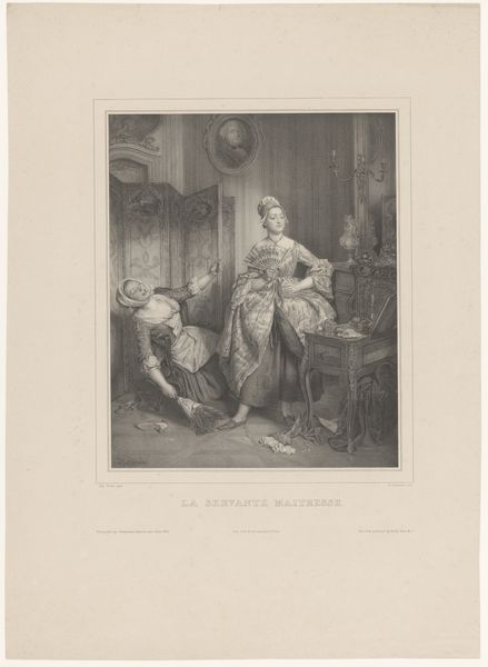 Joel Ballin’s "Tartuffe and Elmire" is a print, meaning it's an image made through a mechanical reproduction process, rather than directly by the artist's hand. Look closely, and you’ll see the subtle textures, gradients, and fine lines, achieved through the skilled manipulation of plates and printing presses. It’s not just about the aesthetic outcome, but about the means of production. Printmaking democratized art, making it more accessible than unique paintings or sculptures. Ballin’s choice of printmaking engages with the burgeoning market for reproducible images in the 19th century, reflecting the rise of consumer culture. The labor is in the skilled craft of the printmaker, translating an image into a format that can be widely disseminated. The very act of reproduction carries social and cultural significance, challenging notions of artistic originality.