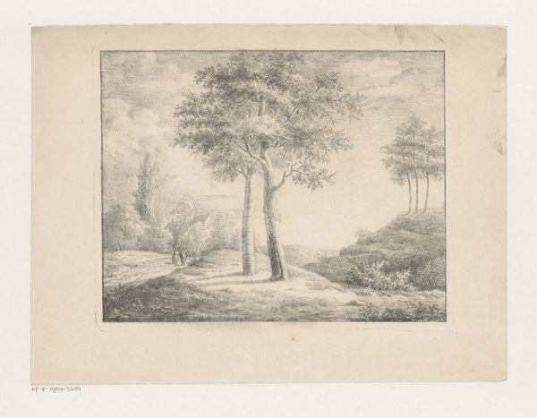 'Landscape with Trees, Two Figures and a Dog' is a pencil drawing created by Willem Valter in the mid-19th century. During Valter's time, landscape art served as a potent reflection of cultural identity and the relationship between humanity and nature. In this drawing, the figures and their dog suggest a narrative element. Consider how gender and class are subtly represented. Are they travelers, laborers, or members of the landed gentry? The very act of depicting figures within the landscape invites us to contemplate our place within the natural order and how social roles are enacted in the environment. This drawing echoes a sense of intimate observation, perhaps a quiet moment captured amidst the changing landscape. The artwork also raises questions about the power dynamics inherent in landscape representation – who has the privilege to traverse and claim ownership of these spaces? This piece encourages us to reflect on the emotional resonance of our own encounters with nature.