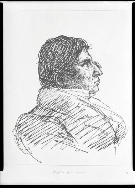 Editor: This is "Portrait of Debret" by Pierre-Jean David d'Angers. It's a small sketch, almost intimate in scale. I'm struck by the starkness of the lines. What resonates with you when you look at it? Curator: Notice how the artist uses line, a kind of shorthand for deeper psychological insight? The sharply defined profile, the shadowed eye – these are visual cues that trigger associations with intellect, perhaps even a touch of melancholy. What cultural memories do these features evoke? Editor: I see a certain severity, a classical stoicism maybe? Curator: Precisely! The artist is not merely recording a likeness, but constructing a symbolic representation of character, inviting us to contemplate Debret's place within a broader intellectual lineage. I wonder, do the rapid strokes diminish or amplify this sense of character? Editor: I think the quick lines actually add to the feeling of immediacy, as if capturing a fleeting moment of introspection. Curator: An interesting point. It seems we've both uncovered different facets of this intriguing portrait!
