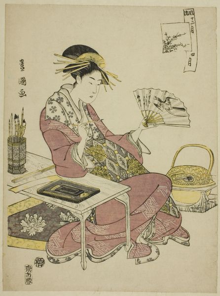 Here we see Toyota Hokkei's print, featuring a seated woman surrounded by various objects and texts, alluding to themes of cultivation and growth. Dominating her kimono is the bamboo motif, a symbol of resilience, flexibility, and longevity in East Asian cultures. The bamboo's symbolism stretches back centuries, appearing in Chinese paintings and poems as early as the Song dynasty. Its ability to bend without breaking mirrors qualities admired in individuals: strength in adversity, grace under pressure. We also see the literal cultivation of bamboo shoots in a pot, a parallel to the metaphorical growth the bamboo represents. This idea of cultivation is like the ouroboros, continually returning to itself in a spiral. Here, the bamboo transforms from material to symbol, suggesting life's cycles of renewal. As you stand before this print, consider how symbols like the bamboo transcend time, embedding themselves in our collective consciousness and influencing our understanding of the world.