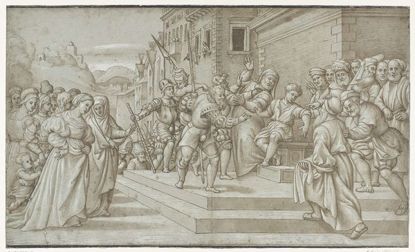 Lucas van Leyden created this print, "The Triumph of Mordecai," using engraving techniques, resulting in a detailed composition of finely etched lines. The figures are grouped together on a shallow stage, with the protagonist Mordecai elevated on horseback, a visual emphasis that is reinforced by the directional lines that converge towards him. Van Leyden uses the graphic medium to create a rich tonal range, moving from light to shadow to suggest both texture and spatial depth, and the architectural backdrop is as meticulously rendered as the human forms. Here, the artist disrupts conventional hierarchies. The linear perspective, while present, is not rigidly adhered to, resulting in a flattening of space. Van Leyden seems less concerned with illusionistic depth and more with the patterning of the surface. The artist engages with the semiotic potential of costume and gesture to convey narrative. Mordecai’s ornate attire and upright posture are juxtaposed with the bowing figures in the foreground to create a scene that privileges surface and detail over classical ideals of harmony and proportion.