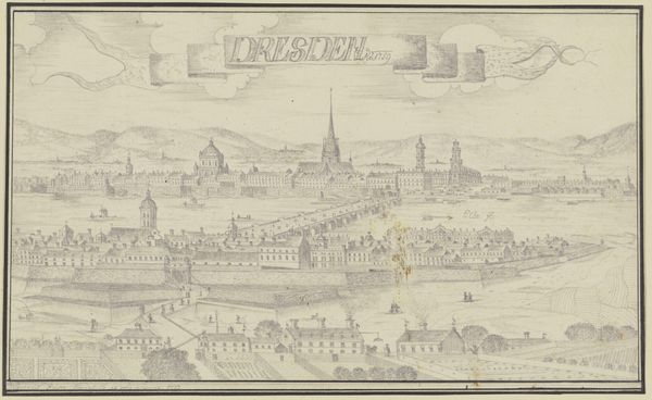 Curator: Well, hello there. Right now, we're looking at a captivating drawing from around 1770, titled "Ansicht von Dresden von der Neustadt aus"—or, "View of Dresden from the New Town," created by Johann Baptist Reiser. It’s rendered in ink on paper and resides here with us at the Städel Museum. Editor: It strikes me as surprisingly still. A quiet observation, almost meditative, even with the intricacy of the city detailed below. It has this distanced feel, like a meticulously crafted memory. Curator: Precisely! Reiser adopts an elevated viewpoint, which was a popular technique in Baroque landscape art. Think of it as analogous to a filmmaker employing a drone today to capture the scope and majesty of the environment and situate the bustling activity of a human community into that surrounding landscape. Reiser places the viewer in this privileged, panoramic position—giving us an almost godlike view of Dresden. The lines are so incredibly precise, especially when you consider that he created this drawing only with ink on paper! Editor: It’s more than just a document; it’s a statement, an ideal perhaps. A stable, ordered society beautifully positioned into its landscape. I am however always questioning these “objective” views as to which specific viewers they were intended to please and inspire confidence in. Curator: Ah, the gaze! Good point. This drawing obviously carries undertones that speaks to the dominant cultural powers. The Age of Enlightenment had its own power dynamics at play and wasn’t for everybody… And looking closely, the walls… Editor: Walls usually speak of fortifications, defenses against a potential threat from outside. Curator: Of course, but it’s more complex than just barriers. Visually, Reiser represents Dresden’s perceived strength and security, reflecting not just its urban layout but the social structures upholding the hierarchy within. These meticulous details serve as powerful tools in shaping our perception, revealing more about the society's ambitions and aspirations than immediately meets the eye. Editor: A romanticized yet exclusionary image of societal harmony. Curator: Indeed! And thank you for highlighting it because this is exactly the sort of discourse the artist must provoke and cherish. What starts out as simple "pretty picture", actually speaks volumes to societal frameworks of any period, including the present one. I'd hope more visitors share your curiosity, and bring in your sensitivity!