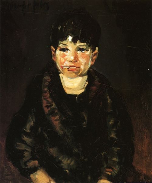 Curator: Up next, we have "Boy with Blue Cap," an evocative oil painting by George Luks, currently residing in a private collection. Editor: Gosh, he's got such an intense, almost spooky aura about him! I’m immediately struck by the stark contrast between his luminous face and the surrounding darkness, a bit unnerving really! Curator: Indeed! Luks’ expressive brushwork and bold color palette are key. The face, illuminated, does pull you in. Observe the loose brushstrokes, a hallmark of Impressionism bleeding into Expressionism, that bring a raw vitality. Note, for example, how the texture in the boy’s cap, painted in striking cobalt blue, plays against the almost tenebrous background. Editor: That blue, though! It almost vibrates against the darkness. But, there’s also a vulnerability there, especially in those hands clasped so tightly. I get the sense that there’s something very human and fragile underneath this intense gaze. He doesn’t come across as simply “boy with a cap.” I am rather caught up in a complex mix of defenselessness and something fierce in his glance! Curator: A fascinating tension, isn't it? Luks often depicted the energy of urban life and its people, often in ways that eschewed idealization. There's a directness, even an awkwardness in his portraits that speaks to a kind of reality beyond conventional beauty. Notice the almost absent eyes that are rendered simply with a void, but manages to engage so vividly, wouldn’t you agree? Editor: Totally! This absence draws my sight beyond the mere look; somehow that blankness, counterintuitively, encourages an intense focus. It is a doorway into some secret world within him. Maybe that’s what’s a bit unsettling, his knowing secrets. The whole thing is painted in this really loose manner, with color just thrown about the composition. Yet the focal point holds together, tight! It's rather clever, actually. Curator: Well, I'd say George Luks captured much more than a mere likeness. I see a testament to human vulnerability and an enduring fascination with the raw edges of human existence. Editor: Yes. An echo of hidden selves staring back at us.