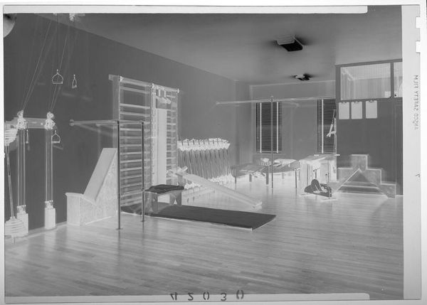 Editor: This is Jack Gould's "Untitled (small architectural model of a kitchen and eating area)." I find the photograph intriguing, especially the stark contrast between light and shadow. What strikes you most about its formal qualities? Curator: The composition is paramount. Observe how the orthogonality of the architectural model contrasts with the organic forms suggested within the space. The image's tonality reinforces the geometric severity. Editor: So, the interplay of geometric and organic shapes is key to understanding the piece? Curator: Precisely. Consider also the photographic process itself, the rendering of three-dimensional space into two. The light doesn't merely illuminate, it sculpts form. Editor: I see what you mean. Thanks for pointing out those elements of light and composition! Curator: My pleasure. Examining art through its intrinsic components reveals layers of meaning.