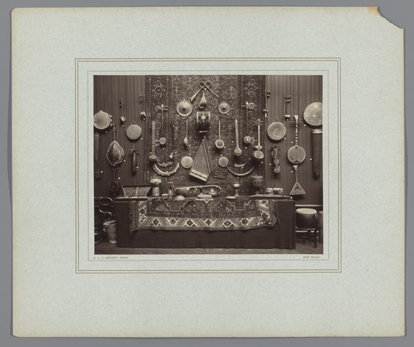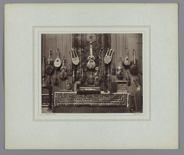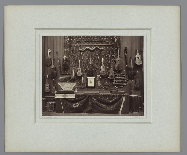 Adrianus van der Grient captured in this photograph from 1893 a curated display of musical instruments from Daniël François Scheurleer's collection. The array of instruments suggests an almost mystical reverence for music, with each piece carefully arranged. Observe the stringed instruments, their forms echoing the ancient lyre of Apollo, a symbol of harmony and order. The presence of wind instruments evokes the pastoral melodies of Pan, connecting us to primal, natural rhythms. These instruments aren't merely objects; they are conduits to emotional expression, each resonating with a different facet of the human experience. The composition, with its emphasis on symmetry, reflects a desire to impose order on the chaotic realm of emotions. Just as Orpheus used music to soothe the savage beasts, the arrangement invites the viewer into a space of contemplation. The photograph itself acts as a stage, where the instruments embody an emotional power that transcends time. These echoes remind us that our cultural memory is long, and that the desire to express ourselves through music is an impulse that is perennial and deeply rooted in our shared human experience.
