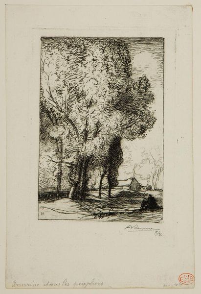 Curator: This is Alphonse Legros's "Meadow Bathed in Sunshine," housed here at the Harvard Art Museums. What’s your first take? Editor: It feels...light. In that wistful, almost melancholic way, like sunlight fading. Curator: Yes, the etching itself, the incised lines on the metal plate, that act of controlled wearing-away—it mirrors the slow, insistent process of time, doesn't it? Editor: Absolutely, and you think about the labor involved, each line a deliberate act, a mediation between the hand, the tool, and the copper... Curator: Which then yields this image that feels so spontaneous! Like a fleeting observation, a stolen moment in nature. It's quite deceptive. Editor: Deceptive, maybe. But ultimately, this work makes you appreciate that every image, no matter how seemingly effortless, is built through materiality. Curator: And through seeing. I look at this meadow, and I remember my own sun-drenched fields and dreamy afternoons. It's a portal. Editor: I see the same, the etching dissolves into the landscape before us. Curator: And that merging of realms, that's where the magic lives.