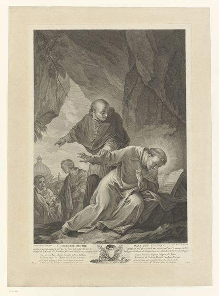 Curator: This is a print, possibly from 1786, titled "Samma beweent de as van zijn zoon Benoni," attributed to Thomas Burke. The somber tonalities are immediately striking. Editor: Indeed, there's a palpable grief here, almost theatrical in its intensity. The figures seem to be arranged deliberately. Is it Baroque, would you say? Curator: Yes, its allegorical theme and figuration are rendered in a late Baroque style, yet leaning towards academic art in its careful composition. Note how the engraver uses line and tone to delineate the forms, emphasizing the drapery and musculature, common to this academic approach. Editor: The symbolism, however, feels deeply personal. The urn, prominently displayed, must hold significance. It's etched with Hebrew letters... Curator: It does seem the focal point. Visually, the light directs us to the grouping of figures by the urn, the texture and tonal contrast, where each person offers a distinct emotive reaction, constructing meaning by framing these responses. Editor: I’m particularly drawn to the young boy’s gesture. Hands clasped in what appears to be prayer, seeking solace. The looming figure behind him - is it an angel? It serves almost as a protector figure to him, juxtaposed with the mournful father to the left. Curator: Precisely. Its effect on viewers, no doubt, then and now, rests in its rendering of emotional experience, filtered and ordered through the symbolic codes of faith and bereavement. Editor: Considering how this visual language of sorrow connects us to historical experience, the enduring image-repertoire reminds us grief itself may be culturally framed and also a very human and individual sensation. Curator: Indeed. And perhaps Burke was less interested in the representation of actual grief and more concerned with presenting an exercise in technical virtuosity, deploying all manner of academic devices and strategies, allowing a reading to remain deliberately ambivalent, for further reflection.