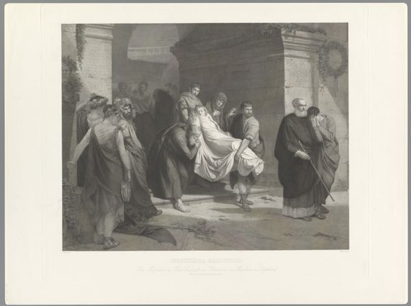Editor: So, this is Carl Bloch's "Christ and the Woman Taken in Adultery," or "Kristus og Synderinden," from 1889. It looks like a print, maybe etching or engraving, on paper. The whole scene has this very serious, almost oppressive feeling to it. What’s your take on this, what strikes you most? Curator: You know, the beauty of Bloch is how he takes these grand biblical narratives and shrinks them down to human moments. Look at the body language: the bowed head of Christ, the woman’s face hidden in shame, the accusatory stares. It’s a masterclass in dramatic restraint, isn’t it? Editor: Restraint, definitely. Everyone seems frozen, caught in this terrible moment. But it also feels staged, almost theatrical, don't you think? Curator: It is, wonderfully so! That’s the academic in Bloch shining through. He's acutely aware of art history, pulling visual cues from the Renaissance masters – the chiaroscuro, the pyramidal composition. But instead of grand pronouncements, he offers intimate psychology. It makes the viewer an uncomfortable witness, wouldn't you agree? Editor: Uncomfortable, yes. It's hard to know where to look, almost like intruding on a private intervention. Curator: Precisely! It challenges us. Do we condemn, forgive, or simply turn away? Art isn't just about pretty pictures, sometimes it’s about holding up a mirror, albeit a slightly smudged one, to ourselves. I think, Bloch intended just that with this engraving. Editor: That’s powerful. I hadn't thought about it as an intentional act of discomfort. Curator: These aren't just ink lines on paper, these are the weights of moral quandaries and I must say it gave me some insights on art.