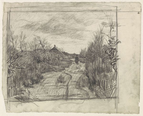 Curator: Before us is Childe Hassam's "A Vermont Village, Peacham." Editor: There's a distinct feeling of a gathering storm. The linear hatching really emphasizes the downpour, doesn’t it? Curator: Indeed. Hassam captures not just the physical space but also the atmosphere—notice how the church spire pierces through the tempestuous sky. Churches always mark sacred ground, but the tension between the village and the weather is unsettling. Editor: The composition itself directs your eye from the dark foreground, where the road and logs lie, right up to that light steeple. The contrast of values creates an incredible sense of depth. Curator: Hassam is subtly commenting on the resilience of community. The church, as a symbol of faith and unity, stands defiant against the oncoming darkness. There is a sense of hope here. Editor: A compelling print. Its structural dynamics and interplay of light and shadow offer more than just a pastoral scene. Curator: It speaks to the enduring strength of human spirit.