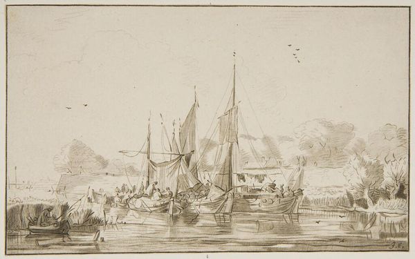 Charles Meryon created this etching, Calais Boats in Vlissingen, using fine lines to capture a busy harbor scene. The composition is split, with two prominent boats on the left and the Vlissingen coastline on the right. This division creates a visual tension, drawing the eye back and forth across the plate. Meryon's mastery lies in how he uses line to define shape and texture. Note the density of lines creating darker tones in the boats' hulls, contrasted with the sparser lines suggesting the open sky. This technique enhances the sense of depth, pulling us into the scene. The structure invites a semiotic reading: the boats symbolize journey and trade, while the distant coastline represents stability. The overall effect is one of dynamism contained within a formally rigorous structure, hinting at broader themes of exploration and the interplay between nature and human activity. This formal orchestration underscores the artwork's enduring power.