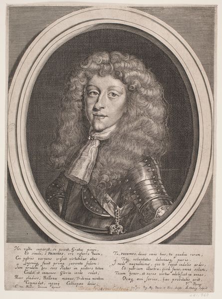 Curator: Here we have a print by Albert Haelwegh dating from 1655, titled "Christian V". It resides here at the SMK, the Statens Museum for Kunst. Editor: My initial impression is one of somewhat unsettling regality. The young man’s eyes are very wide and it has a certain formal rigidity to it, although the lines are elegant, clean. Curator: This engraving reflects the broader context of royal portraiture during the Baroque period, particularly the construction of identity through material culture and social position. The work's symbolism—armor and a formal wig—presents the young royal as an embodiment of power, ordained by legacy. Editor: Precisely. And it’s crucial to note the materiality here. It's an engraving, a painstaking, laborious process. Think of the skilled labor required to produce the plates for dissemination. Each line is carved with intention. Curator: The figure of Christian V also fits neatly within the history-painting and figuration theme we often find in portraits. I'm curious, what does the print medium itself, enable, and constrain in the visual representation of power? Editor: An engraving allowed for multiples; these portraits were instruments of soft power. We see evidence here of artistic production intersecting with dynastic aims; these pieces weren't merely aesthetic. And there’s a consumption aspect, too. Curator: Looking at the relationship between this specific portrayal and Christian’s later actions offers a compelling intersectional lens. Is it mere happenstance that he ended up trying to centralize authority later, or was he shaped, pressured, even pushed to embody that strength. Editor: Right, by looking closer at this print we can almost reverse engineer these pieces, deconstructing the labor that's visible—but more significantly the apparatus that might not be. Curator: It prompts a reflection, doesn't it? About identity and how visual culture actively produces those identities. Editor: Definitely, understanding its genesis makes me consider what even appears in an aesthetic vacuum really isn't.