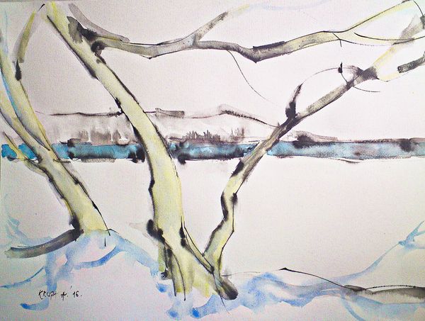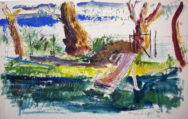 Curator: Here we have Elaine de Kooning’s 1965 watercolor titled "Spring". Editor: It feels like a memory of a landscape rather than a depiction, full of the light and movement of springtime, but not overly descriptive. Curator: I agree. De Kooning's dynamic brushstrokes certainly capture the vitality we associate with the season. Note the emphasis on chromatic intensity through juxtapositions of blues, greens, and browns; this builds structure but evokes rather than defines. Editor: The blues could represent water reflecting the sky. Blues and greens have strong ties with nature. Does her color palette have roots in naturalistic or symbolistic landscape traditions? Is de Kooning using spring as an optimistic signifier, culturally speaking? Curator: I would posit that de Kooning's use of color, while suggestive, transcends pure symbolism. The way the pigment diffuses and interacts with the paper is a formal gesture – an investigation of painting’s intrinsic qualities. She's manipulating the inherent properties of the medium to activate the visual field. Editor: But even abstraction carries symbolic weight. Perhaps the indistinct forms speak to the ephemeral nature of springtime itself, always changing, hard to pin down, a bit restless, but beautiful nonetheless. Also, consider that de Kooning might allude to environmental awareness that would impact cultural sensibilities during that decade. Curator: A compelling point about capturing ephemeral essence! To look closely, though, allows me to admire de Kooning's engagement with the picture plane and how abstract expressionism is pushing the concept of space further into abstraction. The gestures themselves generate that dynamism. Editor: So much is contained within such gestural marks and abstract forms. Spring is often a metaphor for new beginnings and potential. Curator: Yes. Thank you for sharing your perspective on how the symbolic overlays the formalism, to better appreciate "Spring." Editor: My pleasure; perhaps we can see how form reflects culturally embedded notions, allowing de Kooning to generate visual and symbolic resonances that capture something about renewal in her artistic practice and ours.