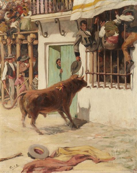 Curator: This painterly oil work is titled "Passage À Bou Saada." It's attributed to Eugène Girardet, an artist known for his Orientalist scenes. Editor: The light immediately struck me – how it sculpts the ochre walls and throws everything into sharp relief. The way it hits that passing figure, illuminating them in that shadowed passageway—it's dramatic. Curator: Girardet frequently visited North Africa. Orientalism often presented a romanticized, idealized vision of the region, but one can observe here how he carefully includes the visual shorthand for local markers of domestic life—a seated figure and goods awaiting trade. This lends itself to narrative speculation. Editor: True, there is this push-pull. We're viewing a scene manufactured, for consumption, yet the painting possesses such intense visual tactility in the surface treatment. Look at the wall texture, created by the artist using such deft touches of impasto! What does the materiality tell us about production and, by extension, Girardet’s intended audience? Curator: Perhaps it tells us about an appeal to those fascinated with authenticity and cultural memory. Girardet uses established, understandable archetypes: The traveler with her donkey signifies movement and commerce, a mother with a swaddled babe signifies care. These are eternal human concerns, instantly relatable despite any cultural unfamiliarity for the viewer. Editor: And what of that shadowed figure? What commodity awaits transport? Considering Girardet's process is interesting because there's almost a sense of artistic exchange, wouldn't you say? He translates his subject through his medium: labor mediated by artistry and European consumption. Curator: A cycle of exchange is implied, even if unequal. Yet, what remains is this resonant image. Editor: Resonant indeed! Girardet's skill brings to life more than just an "exotic" scene—it hints at a lived experience through layers of paint.