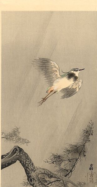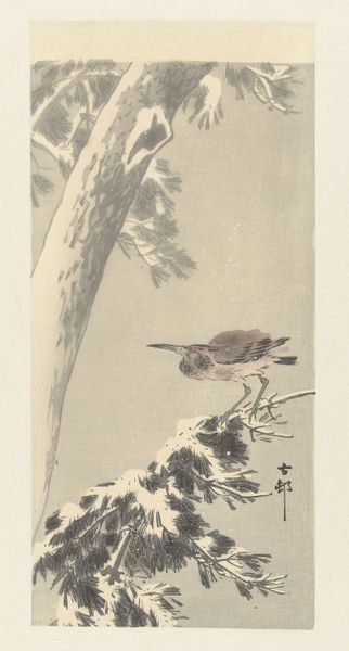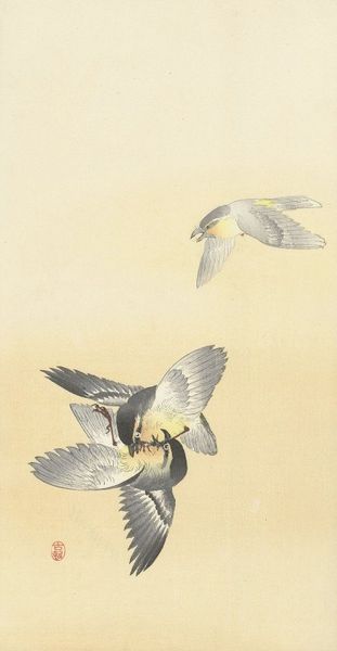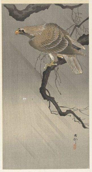 Curator: So melancholic, yet vibrant somehow. Editor: Indeed. Let's delve into this arresting work titled "Songbirds in Rain." It is an early 20th-century woodblock print crafted by the Japanese artist, Ohara Koson, specifically sometime between 1900 and 1910. The scene presents a fleeting moment, an exploration into avian vulnerability amidst the elements. Curator: I see what you mean. The artist manages to suggest a very particular mood. Looking at the grey background and the delicate rendering of the rain, there is something beautifully bleak, you know? It does have a quality akin to some of Whistler’s works in the arrangement of elements within the pictorial space, what do you think about that idea? Editor: A comparative framework always offers intriguing perspectives! There’s that liminal atmospheric quality in Whistler but here in Koson’s print, this piece adheres, structurally, to a dynamic asymmetry deeply rooted in Ukiyo-e traditions. Observe how the birds’ placement isn’t merely representational; the upper bird seems to sing, while the other is pointed almost towards the ground. This evokes both movement and emotional responsiveness to their surroundings. The whole composition conveys a spatial understanding resonant with both symbolism and careful craftsmanship. Curator: Absolutely. And there’s a definite Impressionistic element here. That sketchy line that composes each bird and plant evokes a quick study—an attempt to capture something elusive before it vanishes. And did I mention that the gray and pale sepia palette creates a soft, dreamlike feel? It definitely reinforces the emotional component that you suggest. Editor: Yes, quite so! And given that it is a print, we can examine the deliberate application of color blocks to define form and texture and line which produces those very affecting tonal gradations. What seems spontaneous, isn’t. The artist is intentionally revealing or obscuring parts to generate atmosphere and visual impact, I think. Curator: I get that completely. Okay, so my intuitive sense of the art isn’t fully the truth, huh? Koson gets the last laugh this time! Editor: In art there are no last laughs…only enduring dialogues!