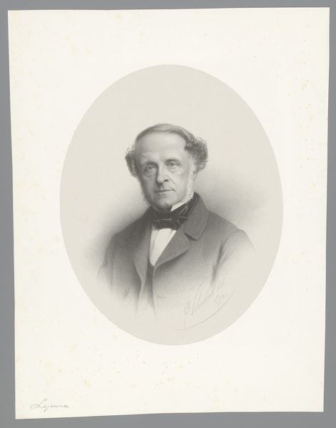 Curator: At first glance, the meticulous lines create an image of almost photographic clarity, and I must say that he doesn't appear pleased with something... Editor: Well, let me set the stage. This engraving, completed in 1852, is titled "Portret van Jan Baptiste De Jonghe". The artist behind it is Joseph Schubert, and it’s now housed in the Rijksmuseum. Schubert worked mostly in lithography, so his experience gave him special insight with which to work the printing surface. Curator: Engraving, though? Interesting choice for a portrait. Given the era, and knowing my engravers, that must have required weeks, maybe months of meticulous work with the burin... You really feel the dedication here, it's not just skill. It feels reverent. Editor: You are absolutely right. Schubert uses engraving to mimic the tonal range and detail found in paintings of the era, although this work also displays elements of Realism, in its accuracy, and Romanticism, through an idealized lens. The crisp lines and shading are quite effective. Curator: His eyes are quite striking. There's a hint of knowingness behind those glasses, as if he’s seen more than he lets on. It certainly isn't just a record, like a photograph can be—it is somehow also a reveal. Editor: You can perceive it as such. I perceive how the composition itself, focusing so centrally and frontally, conveys a sense of steadfastness and importance, even though the subject may be perceived as "mild" by the common man. Curator: Yes, he’s certainly no imposing Napoleon! But there's something incredibly earnest in that gaze...makes you want to ask questions and linger a while to hear what he has to say...I am almost certain he enjoyed a good book and appreciated silence. Editor: I find that in its stark lines and confident declaration, the portrait captures something significant about 19th-century bourgeoisie aspirations and status that photographs can often overlook, something I greatly appreciate. Curator: A silent poem, if you ask me. Thank you for your insightful perspective on this striking print! Editor: My pleasure. It is often fruitful to allow artworks to speak for themselves and reveal nuances from many distinct perspectives.