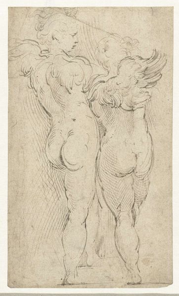 Editor: We're looking at "Two Nudes," a charcoal drawing created around 1525 by Jacopo Pontormo, currently residing in the Uffizi Gallery. The figures feel dynamic, almost caught mid-motion. I'm curious, what do you see as the most compelling formal aspects of this piece? Curator: The immediate aspect which strikes the eye is Pontormo’s manipulation of line. Notice how the sinuous contour emphasizes the torsion within the figures' forms. This is further accentuated through Pontormo's strategic implementation of *chiaroscuro*; stark contrasts that highlight specific muscle groups to produce an intensified emotional resonance. The dynamism which you sensed is largely achieved through these very contrasts, particularly around areas where light catches bone and sinew, furthering accentuating dramatic poses typical of the Mannerist style. Editor: It’s interesting you point out the contrast because initially, the blended charcoal made me think of softness. So, the light and dark do fight for dominance in this image. What would you say is the effect of using charcoal versus, say, ink in achieving this look? Curator: Indeed, it is this interplay which animates the composition. Charcoal permits a flexibility in tonal gradation unattainable with ink. The artist here has employed it masterfully to imply volume without necessitating meticulous detail, leaving regions suggestive and open to interpretation. It also mirrors a classical artistic thought: That *disegno*, drawing and design, are supreme indicators of artistic brilliance. The lack of colour, therefore, removes superfluous distractions. Editor: So, by using the medium of charcoal in such a deliberate way, Pontormo almost directs our gaze, making us fill in the blanks ourselves. Curator: Precisely. The strategic obscurity encourages an active participation from the viewer. Pontormo doesn't offer answers so much as visual suggestions. A formal tactic typical to art being made at the time. Editor: I see. Thanks, exploring Pontormo's use of charcoal through this lens really illuminates the thought and complexity behind this work. Curator: Indeed. Considering the *disegno*, allows for further inquiry into the art’s overall intent, as well as an aesthetic experience which transcends time.