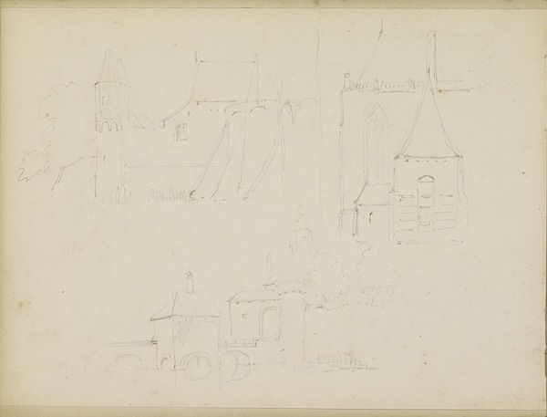 Adrianus Eversen created this drawing of buildings using graphite on paper in the 19th century. The delicate lines suggest a quick, preliminary sketch rather than a highly finished work. The softness of graphite allows for subtle gradations of tone and texture, creating a sense of depth and atmosphere even with minimal detail. It’s a humble material, easily accessible and widely used for both preparatory studies and finished drawings. The choice of paper as a ground speaks to a tradition of sketching from life, a practice valued for its immediacy and directness. There’s an intimacy to this kind of work. Eversen's choice of these simple materials emphasizes the importance of observation and direct engagement with the subject, bridging the gap between everyday life and artistic creation. It reminds us that the value of art isn't always in the complexity of the materials, but in the artist's ability to capture a moment in time with simple humble means.
