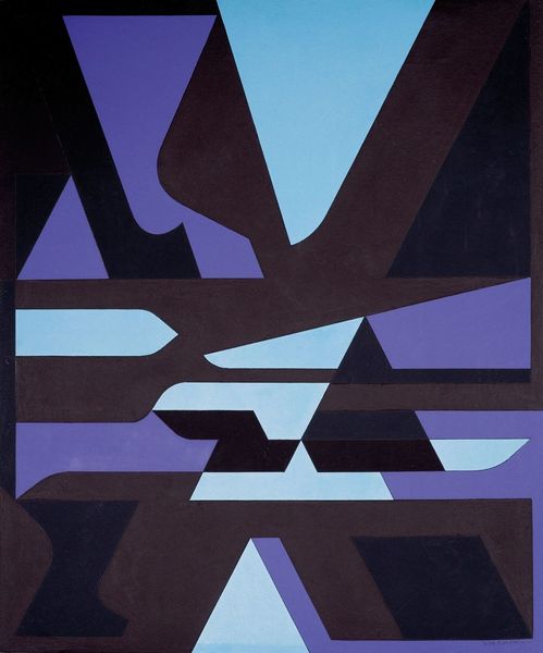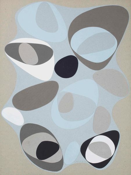 Editor: Here we have Leo Leuppi's "Wachstum II" from 1950, an acrylic painting dominated by geometric forms in blue, grey and white. I'm struck by how these shapes seem to simultaneously float and interlock. How do you interpret this work, especially in relation to its materials and creation? Curator: It's fascinating to consider this piece through a materialist lens, especially the layering of acrylic paint. Leuppi's careful application and manipulation of this relatively new medium, especially given its 1950 creation, invites consideration of process. Consider the social context: postwar Europe, mass production was transforming everyday life. How might these emerging technologies and industrial methods be echoed, or resisted, in Leuppi’s careful layering of form? Do you see evidence of a tension between handcrafted artistry and industrial ideals? Editor: I see what you mean. The clean lines and simplified forms could reflect the influence of industrial design. But the subtle variations in color and the slightly uneven edges of the shapes feel very hand-done. Almost as if Leuppi is hinting at the limitations of industrial replication. Curator: Precisely. And let’s not forget the canvas itself—the very ground upon which this ‘growth’ occurs. The weave and texture, usually hidden by layers of traditional oil paint, are left relatively exposed, adding another layer to this material dialogue. What is Leuppi trying to “grow” here, and using what means? Is it an artistic expression, an inquiry into mass production, or a social critique? Editor: It makes you think about what "growth" means in an increasingly industrialized world. Maybe he's not just depicting growth but also questioning the *how* and *why* behind it. This perspective on the materiality and means of production makes the artwork speak differently! Thanks! Curator: Exactly. By understanding its historical materials and considering the context of its creation, we move beyond pure aesthetics to investigate the economic and social forces that shaped its production and can influence our understanding of the artist's vision.