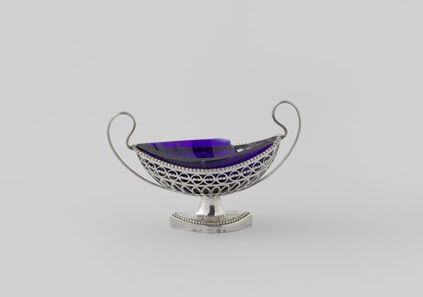 Curator: It has such a jewel-like quality. It is somehow so opulent and restrained all at once. Editor: I agree. What a stunning piece! We're looking at an object known as “Holder, Round, on Three Legs Connected by Leaf Garlands with Ram's Heads." Crafted around 1775, and the maker of this piece is Barend Swierinck. Its core elements comprise glass and ceramic embellished with silver. Curator: That cobalt blue of the glass contrasts beautifully with the cool silver. Observe how the Rococo style manifests here. The swirling leaf garlands and the sculpted ram's heads introduce dynamism around the static architectural legs. Editor: Yes, the interplay between the organic forms and the structured base creates a delightful tension. Objects like this served more than just a functional purpose; they broadcasted the owner’s wealth, their taste, and their access to skilled artisans during the late 18th century. These luxury objects were, after all, often produced for aristocrats and elite circles. Curator: Precisely. But beyond its historical context, I'm struck by the materiality. The reflective quality of the silver against the light-absorbing blue of the glass generates a play of surfaces, a sense of depth. Editor: Right. The ram heads also carry potent symbolism. As powerful figures often connected with virility and strength, but also a hint of the pastoral and classical themes that gained traction then. Curator: These animalistic motifs disrupt any rigid classical reading that could emerge given the form, the Doric column influence for instance of its legs. It becomes this delicate balance of opulence, order and extravagance. Editor: Absolutely. This "holder" provides so much insight. A material microcosm of societal ambition, taste and craft, frozen in a singular object of display. Curator: Yes, there's an energy contained within it. To distill history into form and materiality, a satisfying convergence of meaning and making.