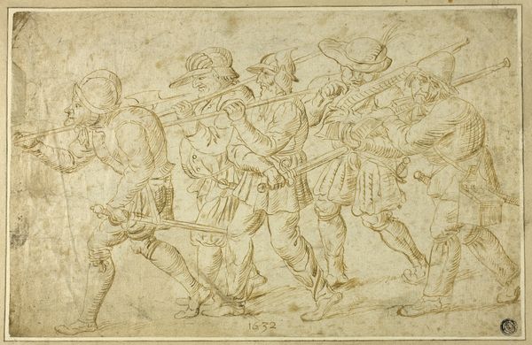 Alessandro Allori designed this narrative frieze, a commander addressing his troops, using pen and brown ink with brown wash, heightened with white gouache, over black chalk on light brown paper. Allori lived and worked in Florence in the late 16th century. As a design for a frieze, this drawing would have been intended to be part of a larger decorative scheme, perhaps in a palace or other public building. The subject matter, a military commander addressing his troops, would have been appropriate for a space where civic values and ideals were celebrated. The visual codes of the image, such as the classical armor and weaponry, evoke the Roman Empire, which was often used as a model for Florentine statecraft. The composition, with the commander at the center and the troops arrayed around him, reinforces the hierarchical social structure of the time. To fully understand this work, one would want to examine the history of Florence, and its institutions of power.