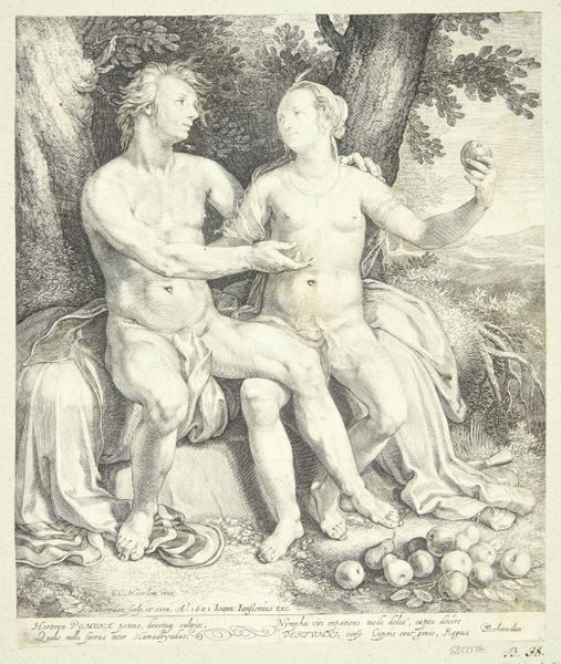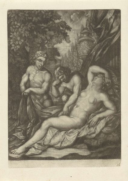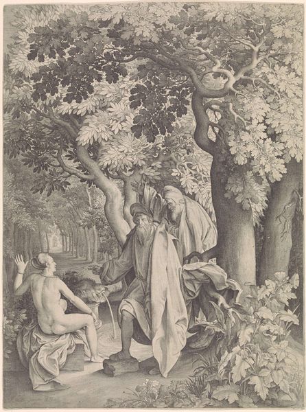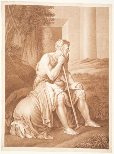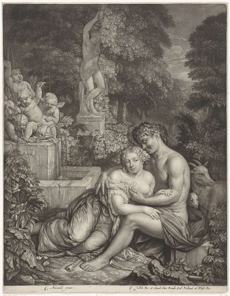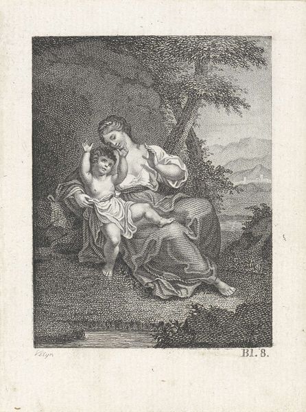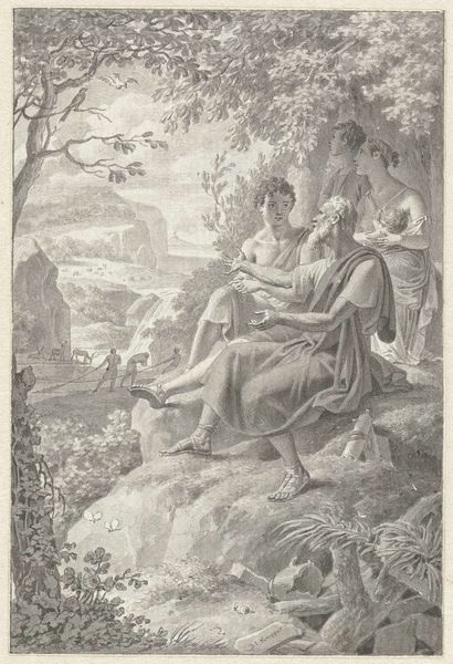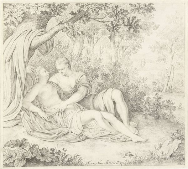 Jean Grandjean created this black and white drawing, Orpheus Comforting Eurydice. The composition centres on the figures of Orpheus and Eurydice, set against a backdrop of dense foliage. It invites a mood of tender melancholy. The artist uses closely packed fine lines to create areas of light and shade, which gives the drawing its texture. The composition is arranged so that the natural world mirrors the emotional exchange between the figures. Orpheus’s body language appears active while Eurydice's posture indicates passive grief. The tree behind them bends in a similar way to how she does, thus mirroring her emotional state through form. The technique employed here reflects broader artistic concerns of the period. The image plays with balance and contrast which are key elements of neoclassicism. This emphasis suggests that the visual and emotional impact hinges on balance, and the artist seeks to convey that message through form.