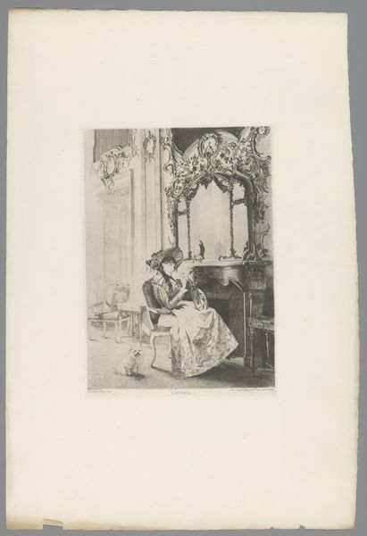 Editor: This etching from 1874, "Young Girl at a Birdcage by the Window", made by Constant Aimé Marie Cap, has this lovely melancholic mood about it. What do you make of it? Curator: Melancholy indeed. It speaks volumes, doesn't it? Look how the light catches her dress, almost mimicking the bars of the cage. I can almost smell the damp air of that room; it’s heavy with unspoken yearnings, isn't it? Does she long for the freedom of that little bird or, perhaps, recognize its confinement as her own? And tell me, what do you notice about the room itself? Editor: It's quite cluttered, but elegant. There’s a piano. She must have a fairly privileged life. Does that change your perspective about her possible desires? Curator: It deepens it, I think. Privilege doesn’t inoculate one against longing. In fact, sometimes those gilded cages are the hardest to see. Perhaps her music brings a type of fulfillment or exacerbates the feelings of ennui; which do you see? Editor: That is so thought-provoking. I originally saw a girl longing for adventure. Now, I'm wondering if she’s stifled even with all these beautiful things. Curator: Art is magic like that, isn't it? The artist captures a single moment and we see something totally new each time we view it. I’d argue that with any viewing, even art professionals learn and grow along the way!
