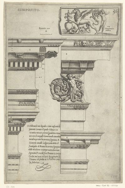 Curator: Oh, this old thing! This is "Toscaanse zuil en hoofdgestel," a 1636 drawing. Probably intended more as a technical print, an architectural study, really. Editor: Right! It’s an architectural rendering on paper, of an... ancient column? It feels so precise and orderly. It’s a very geometric-looking print, made with lines and engravings. The name suggests it’s a Tuscan style. I can also read that name at the top. What is this exactly? What does it tell us about architecture from the Renaissance? Curator: More than first meets the eye! It’s all about proportion. Look how the artist uses geometry – the circles layered on the right-side rendering. See the notes scattered all around. Architectural ideals, classical orders… How do you think such a piece reflects the artistic thinking of the Renaissance? Editor: It makes me think about that era's fascination with bringing back ancient Greek and Roman knowledge. The artists back then were into mathematics and idealized forms, like trying to find the "perfect" measurements of things. It's about looking back for a "better" past. Curator: Precisely! These seemingly dry architectural prints whisper of humanity's desire to codify beauty, measure elegance. The Renaissance sought the harmony between humanism, art and science... which is maybe something to think about now, too. Do we really know where our digital world is going? Editor: Well, I’m definitely looking at columns differently now! Seeing the order behind the image has opened my eyes. Curator: Indeed! It always does once we scratch beneath the surface, doesn't it?